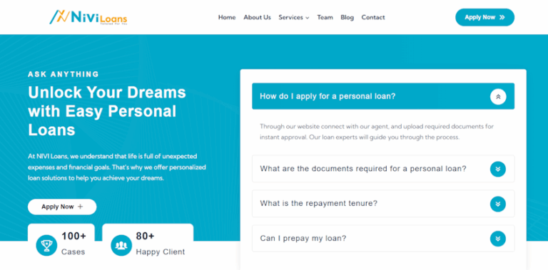 A dedicated landing page with the headline “Unlock Your Dreams with Easy Personal Loans,” trust elements (100+ cases, 80+ happy clients), an interactive FAQ accordion, and a streamlined 3-step application process.