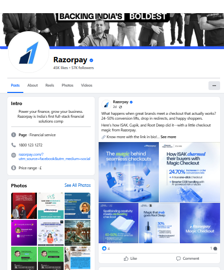 Different audiences and content formats. Facebook/Twitter reach older decision makers (CFOs, founders). Instagram captures younger entrepreneurs and cultural narratives. LinkedIn dominates B2B. Razorpay maintains all channels to capture entire buyer personas rather than over-indexing on any single platform. This multi-channel approach reduces platform dependency risk.