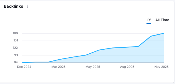 The backlink profile showed a healthy upward trajectory — from 60+ backlinks in December 2024 to nearly 180 by November 2025. This indicated natural link acquisition through client websites, directories, and vendor listings.