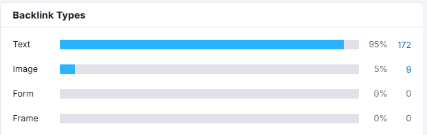 • 95% text-based backlinks (172 links) — strong contextual relevance signals