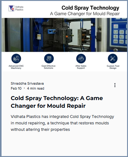 Educational, non-promotional blog content positioned Vidhata as a knowledge hub. Topics included cold spray technology for mould repair, smart mould systems, digital twin analysis, biodegradable plastics, and nanotechnology in plastics.