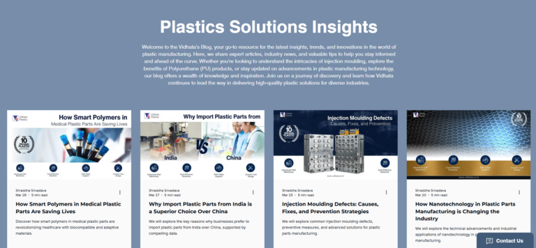 Content marketing positions manufacturing companies as knowledge authorities in their industry. Vidhata’s “Plastics Solutions Insights” blog covering advanced moulding technologies, material science innovations, and industry-specific guides attracts engineers, procurement managers, and plant heads — the exact decision-makers who become qualified B2B leads.
