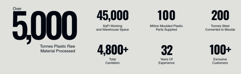 A metrics-driven section showcasing 5,000+ tonnes processed, 45,000 sq ft workspace, 100 million moulded parts, 200 tonnes of steel converted, 4,800+ cavitations, 32 years of experience, and 100+ exclusive customers.