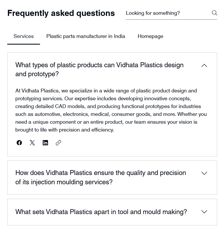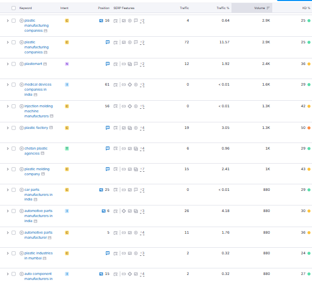 The SEO approach focused on industry-relevant, high-intent B2B keywords. The homepage and service pages were optimized around terms including “plastic injection mould manufacturer in India,” “precision plastic parts,” “tool & mouldmaking,” and “product design and prototyping.” Long-tail keywords like “injection moulding parts supplier India” targeted buyers closer to purchase decisions.