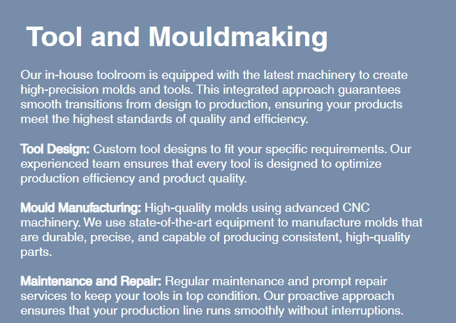Each service section was restructured with keyword-aligned headings — “Product Design and Prototyping,” “Tool & Mouldmaking,” and “Injection Moulding and Parts” — enabling Google to identify page relevance quickly.