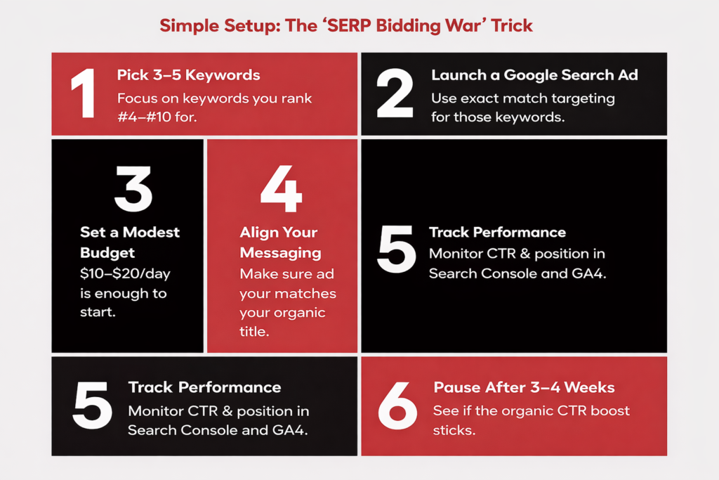 If organic CTR improved meaningfully and held after the pause, the strategy worked. If it returns to baseline, the keyword may not be a strong candidate, or the organic snippet needs improvement before retrying.
