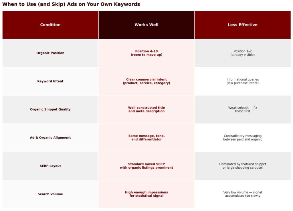 Your organic position is between four and ten. The effect is most pronounced in this range because there’s meaningful room to move up and because CTR is genuinely constrained by position, not by page quality. If you’re ranking on page two, running ads creates some brand exposure but is unlikely to trigger the same algorithmic test.