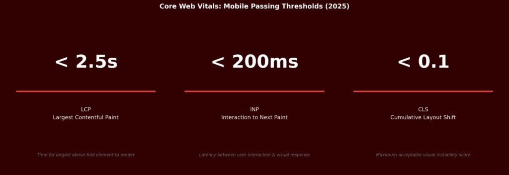 Core Web Vitals are the three metrics Google uses to evaluate page experience, and the passing thresholds are measured against real mobile users on real networks, not simulated desktop performance. That distinction matters more than most teams realize.