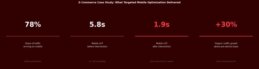 An e-commerce brand selling premium home products had 78 percent of traffic arriving on mobile, with a desktop LCP of 1.4 seconds and a mobile LCP of 5.8 seconds.