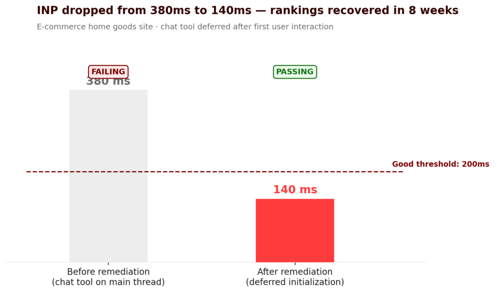 The conversion impact of INP failures is less well-documented than LCP but arguably more commercially significant for complex pages.