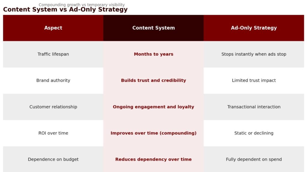 The compounding nature of these matters. A well-ranked piece of content generates traffic for months or years. Contrast that with paid search, where visibility disappears the moment you stop spending. Content marketing builds an asset. Paid media rents a channel.