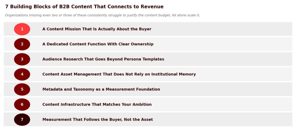 The seven building blocks below are not a content strategy framework in the aspirational sense. They are operational prerequisites.