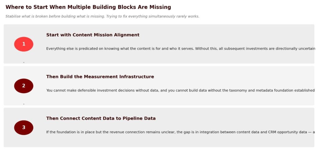 The instinct when auditing a content program with structural gaps is to try to fix everything simultaneously. That rarely works. The right sequence is to stabilize what is broken before building what is missing.