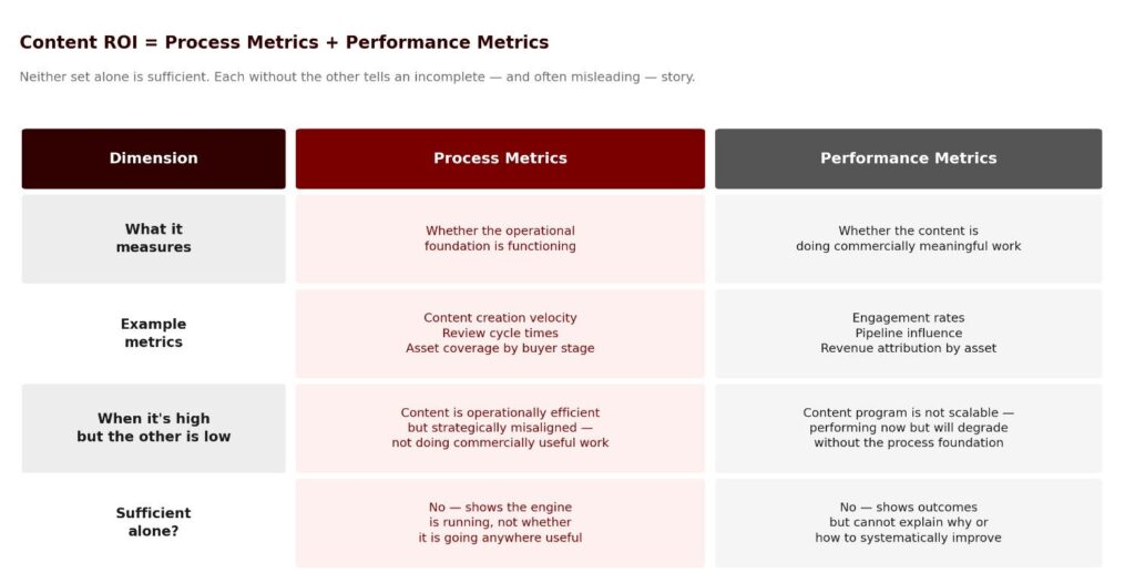 Neither set of metrics alone is sufficient. High-performance metrics with poor process metrics usually mean the content program is not scalable. Good process metrics with poor performance metrics usually mean the content is operationally efficient but strategically misaligned.