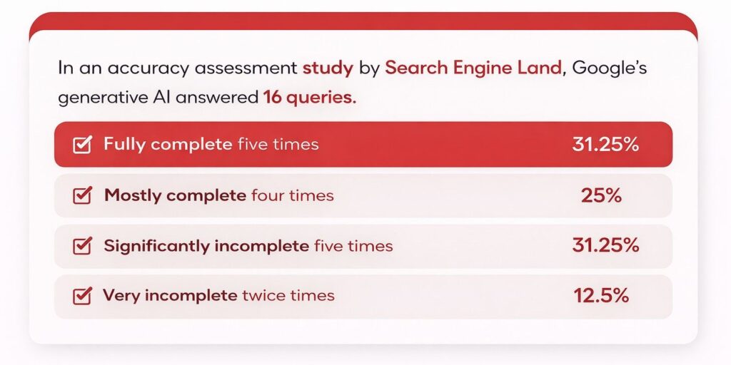 That means roughly 44% of responses had meaningful accuracy or completeness problems. For a system sitting at the top of the most-used search engine on earth, that is a material concern.