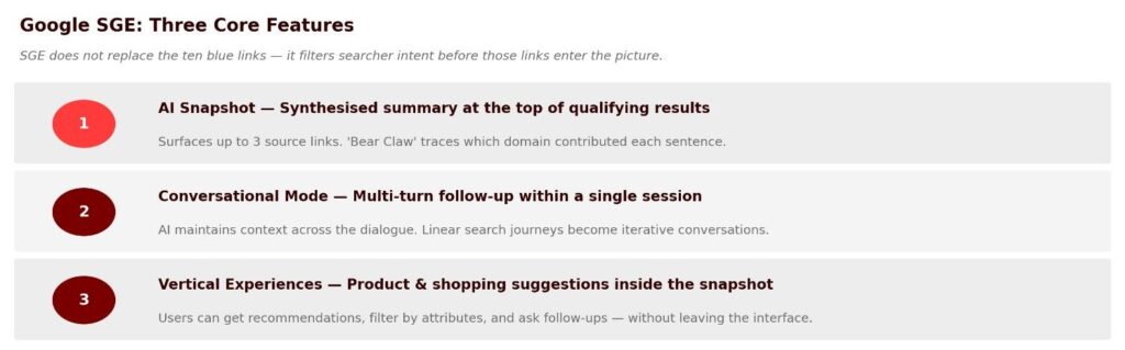 SGE is Google’s attempt to build a generative AI layer directly into search. Rather than returning a list of links and asking the user to synthesize information themselves, SGE generates a direct response to the query, draws from multiple authoritative sources, and surfaces those sources alongside the answer.