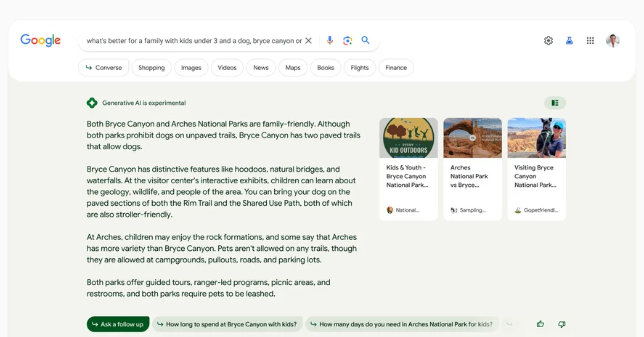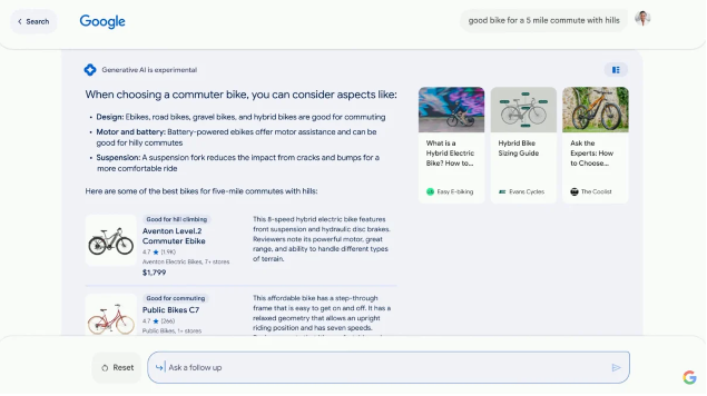 For product and shopping queries, SGE integrates purchasing suggestions directly into the AI snapshot. A user researching a mountain bike with specific features can get product recommendations, filter by attributes, and ask follow-ups, all within the generative interface.