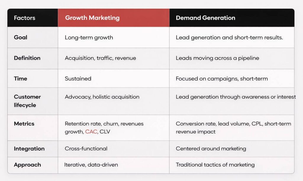 The fundamental difference is scope. Demand generation asks, “How do we create a pipeline?” Growth marketing asks, “How do we build a business that compounds?” Both questions matter. Neither one is sufficient on its own.