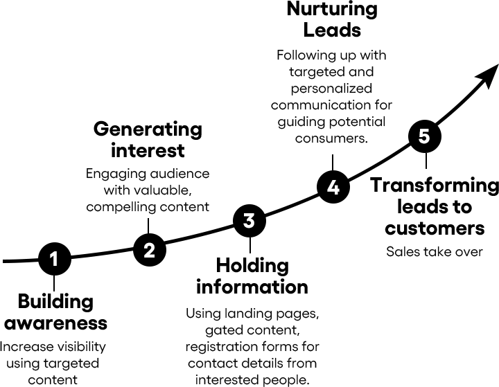 The pipeline it feeds is linear: attention, interest, consideration, conversion.