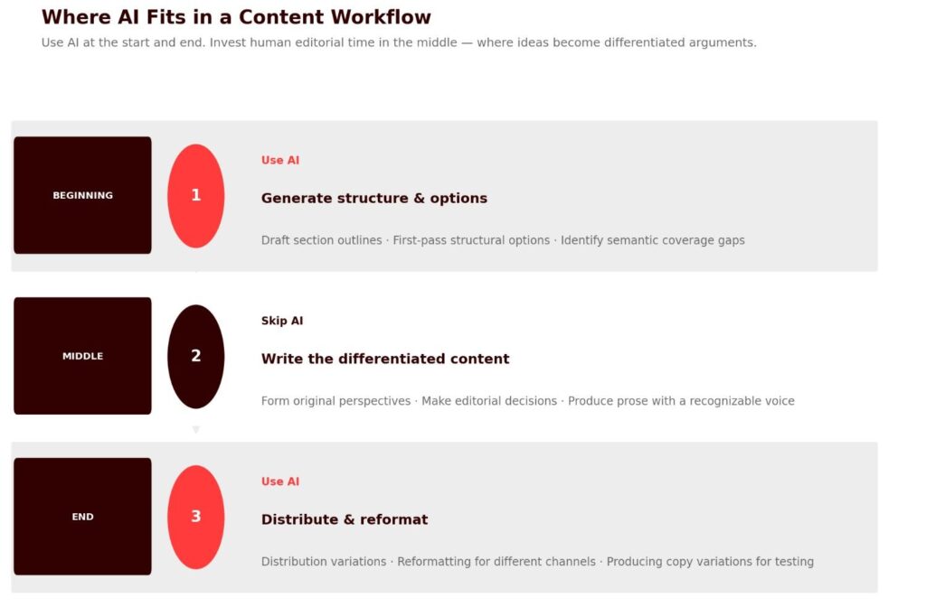 The workflow implication: AI is most valuable at the beginning and end of a content production process. Use it to generate structural options quickly, skip it for the substantive writing that requires real expertise, and use it again for distribution variations and reformatting. The middle of the process, where ideas become arguments and arguments become differentiated content, is where human editorial time is best invested.