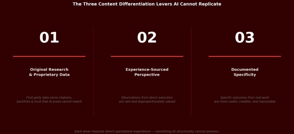The practical application: When writing any piece of content, ask what your team would say about this topic that contradicts, qualifies, or adds meaningful nuance to what already exists in search results. If the honest answer is nothing, that is either a content topic not worth pursuing or a gap in your internal knowledge that needs addressing before the content can differentiate.