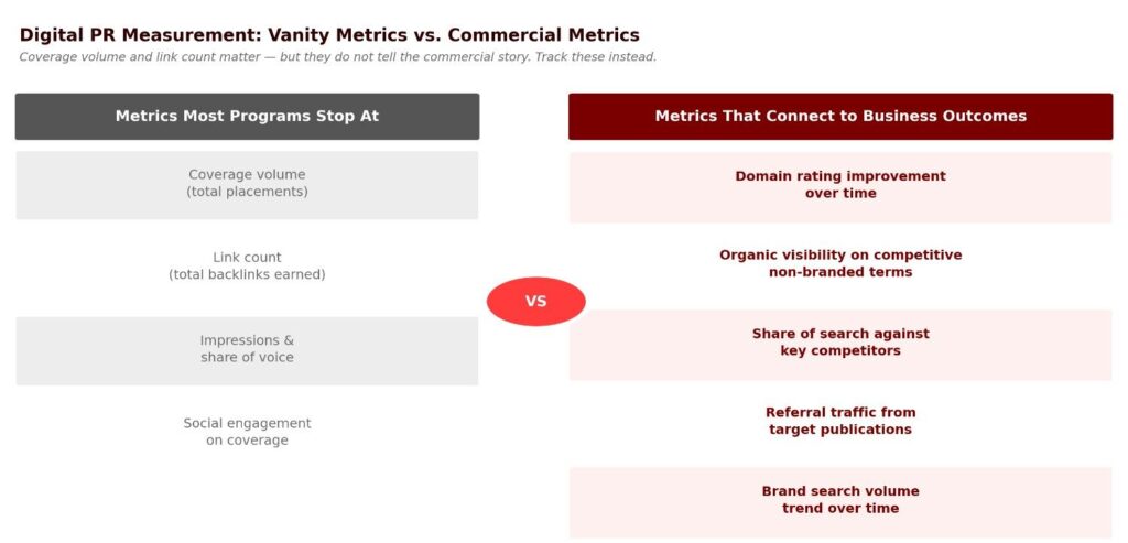 Digital PR measurement often stops at coverage volume and link count. Those metrics matter, but they do not tell the commercial story.