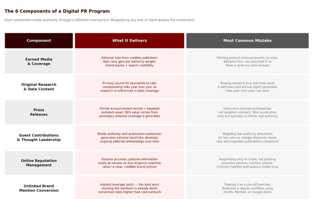 The distinction between valuable guest contributions and low-quality guest post programs is important here. Publishing original analysis, genuinely expert perspective, or category-specific insight in well-regarded industry publications is Digital PR. Publishing generic articles on directories and low-authority blogs to acquire links is something else, and Google’s systems have become increasingly effective at discounting it.
