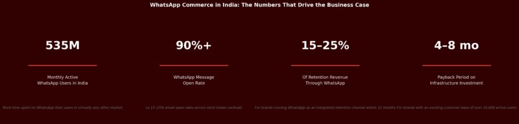 India has roughly 535 million monthly active WhatsApp users. That number is cited often. What gets cited less is the behavioral reality underneath it: Indian consumers spend more time on WhatsApp than users in virtually any other market, and they have normalized purchasing decisions happening inside chat threads. This is not a future behavior you are waiting for. It is already the operating environment.