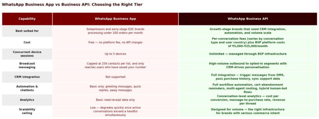 The API tier is where commerce infrastructure lives. Accessed through Meta’s Cloud API or via a WhatsApp Business Solution Provider (BSP), this layer removes the volume constraints and opens integration with your existing tech stack.