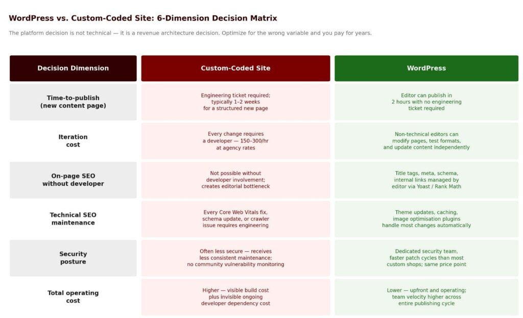 On a custom-coded CMS with a developer dependency, getting a well-structured page live might take two weeks. On WordPress, your editor can have it published in two hours. That is not a marginal advantage.