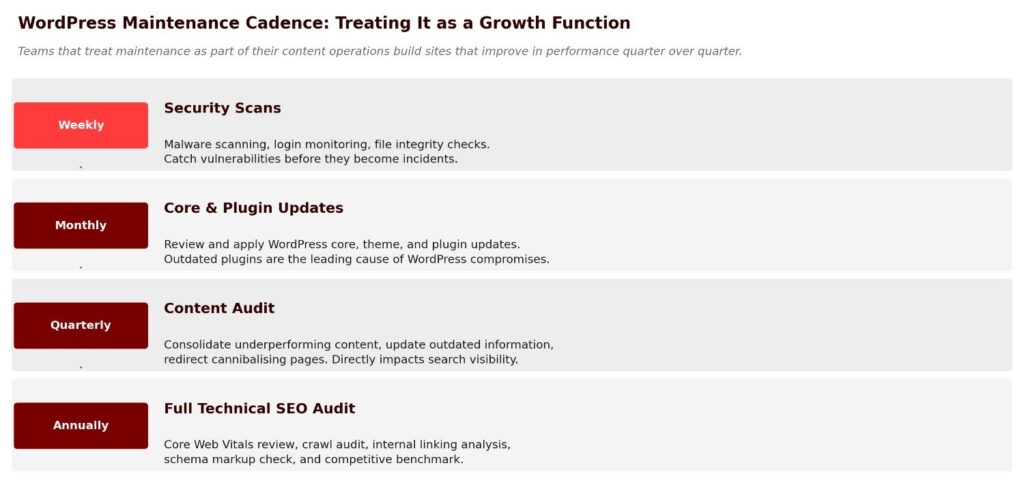 The practical cadence: Core and plugin updates reviewed monthly, security scans weekly, content audits quarterly, and a full technical SEO audit annually. WordPress makes all of this achievable with a lean operations setup.
